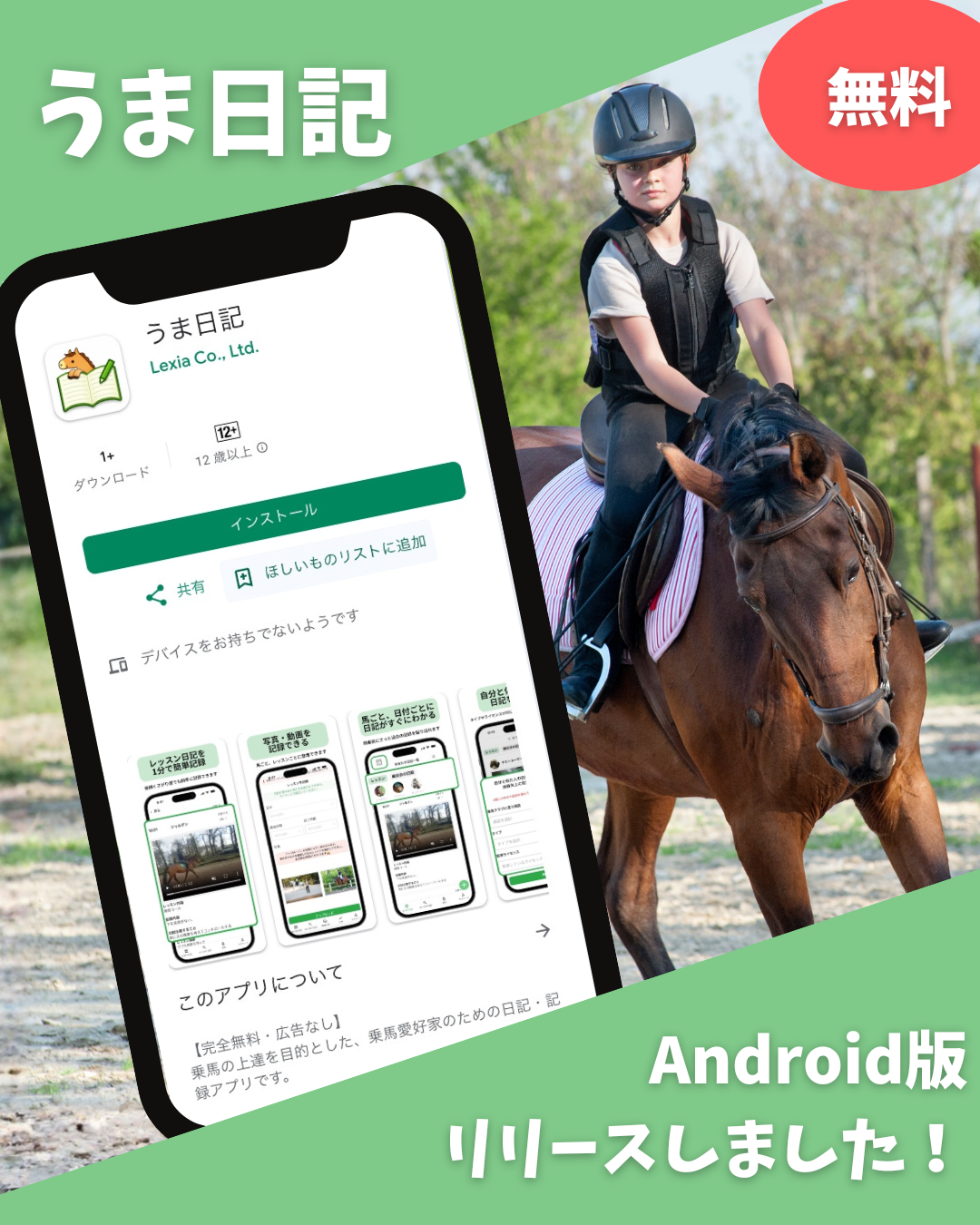 こんにちは! 乗馬用品店レクシアです! たくさんの方にご利用いただいている乗馬日記アプリですが、先日Android版もリリースしました! たいへんお待たせいたしました💦 こちらのアプリは無料で利用できます。 ぜひ技術向上や思い出記録としてお役立てください💚🐴 インストールはこちら