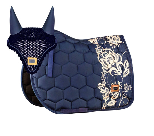 サテンレースサドルパッド&イヤーネット 2点セット ネイビー/ベージュ 馬場用 障害用 ゼッケン イヤーネット