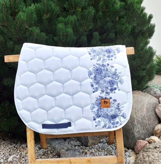 サテンレースサドルパッド クリーミーホワイト/ネイビー 馬場用 障害用 ゼッケン
