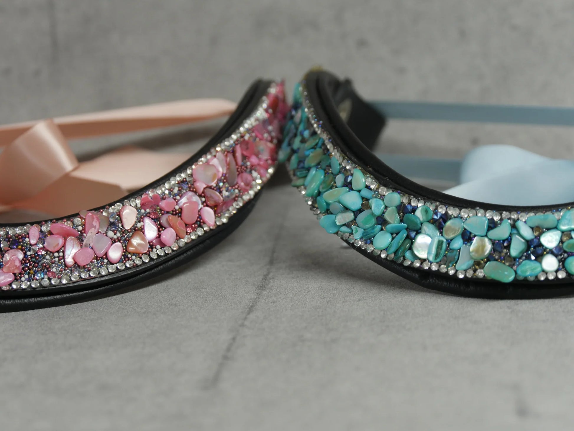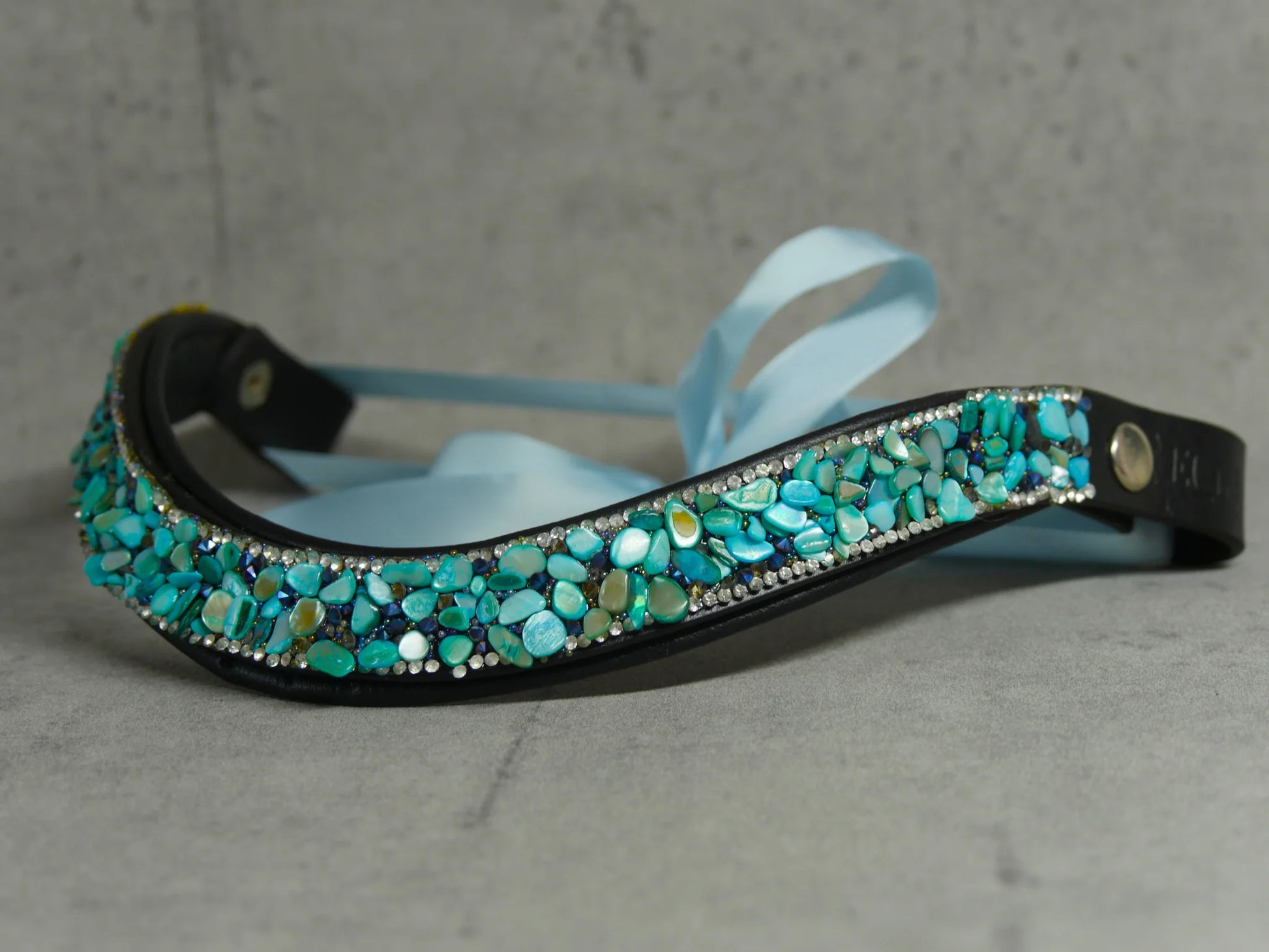 スワロフスキー額革 孔雀の羽モチーフ ターコイズ ブラック/ブラウン コブサイズのみ equosimperi