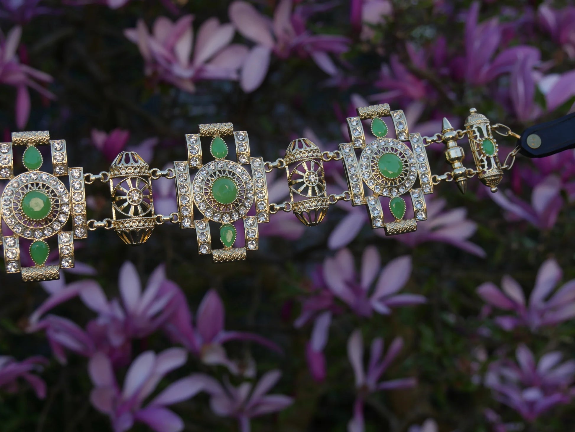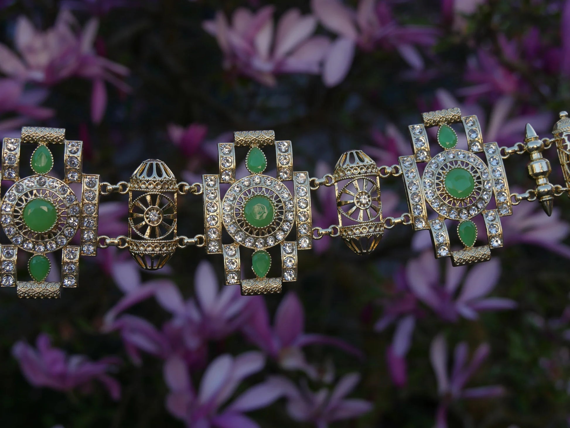 オリエンタルなサファイア色のストーンとゴールドの装飾が特徴で、写真撮影などの特別な日に最適です。