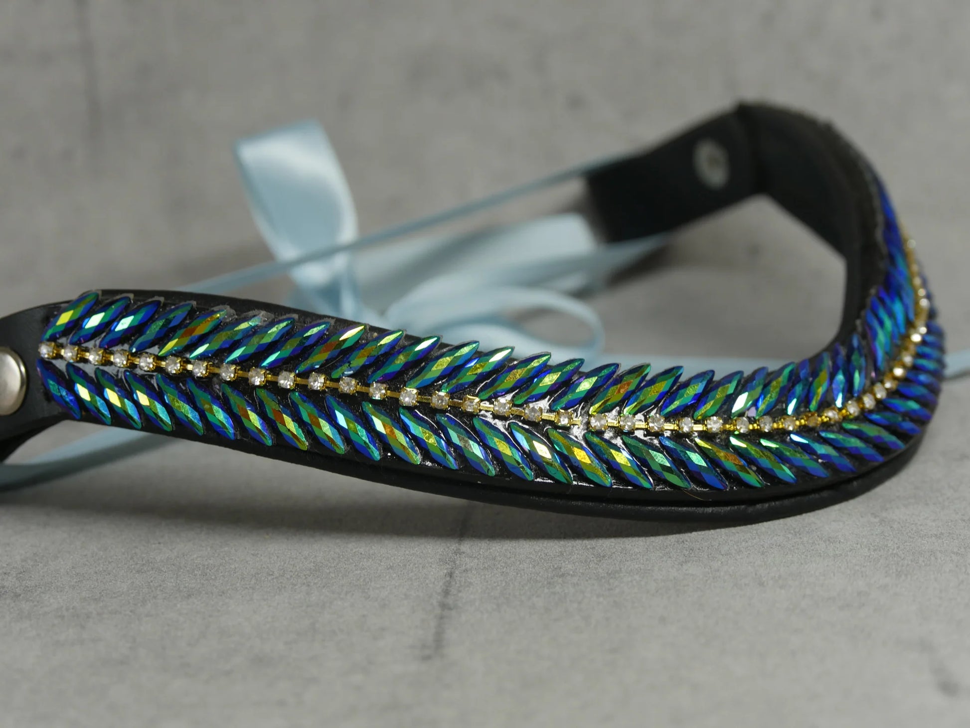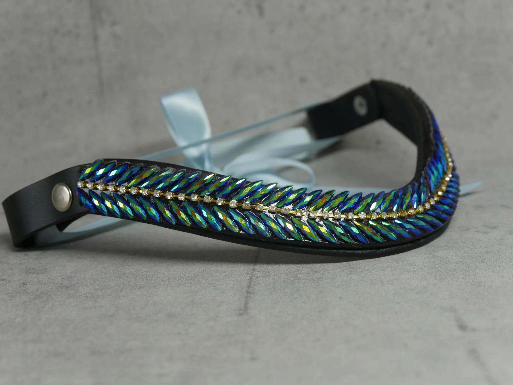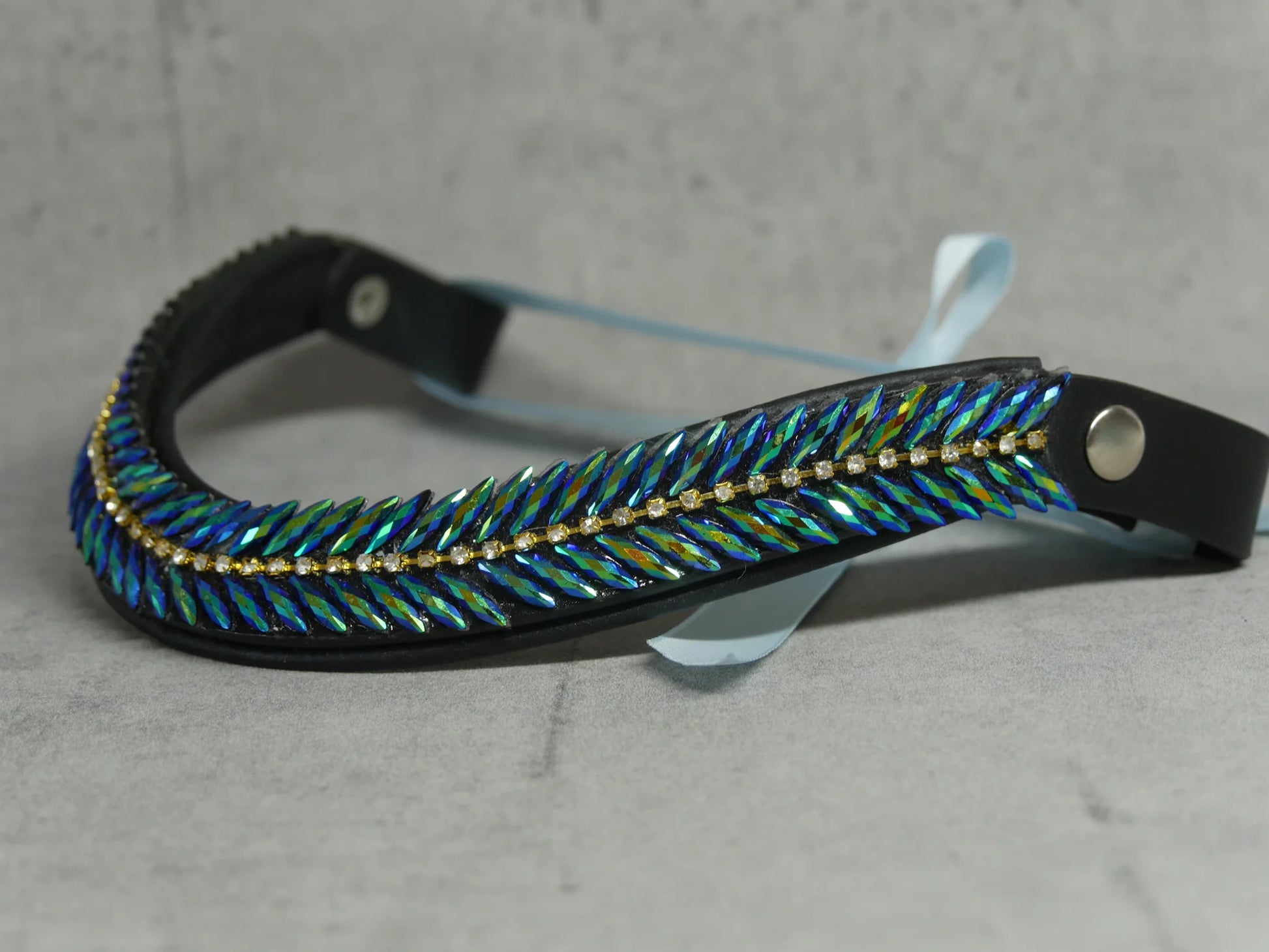 スワロフスキー額革 孔雀の羽モチーフ ターコイズ ブラック/ブラウン コブサイズのみ equosimperi