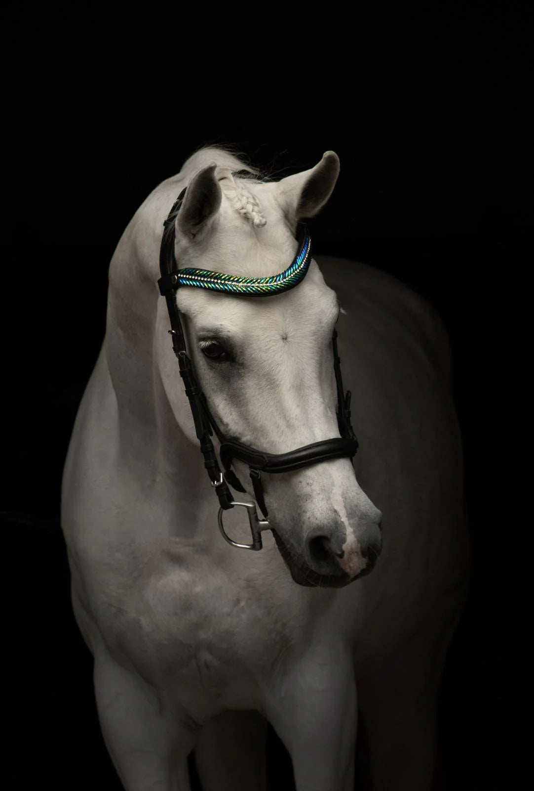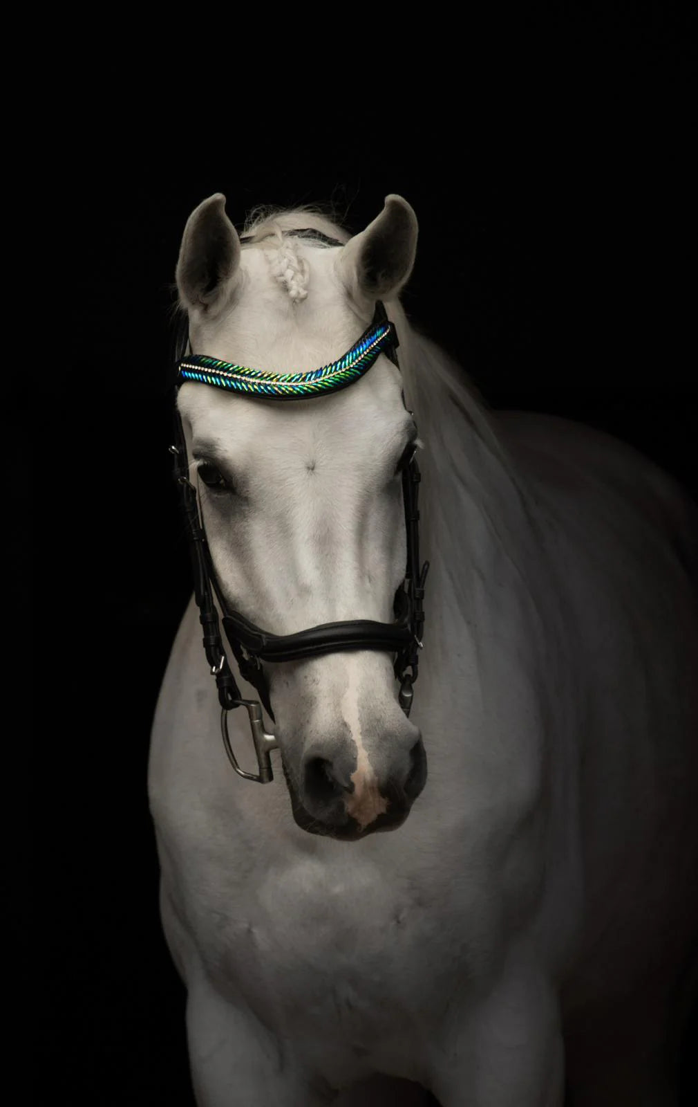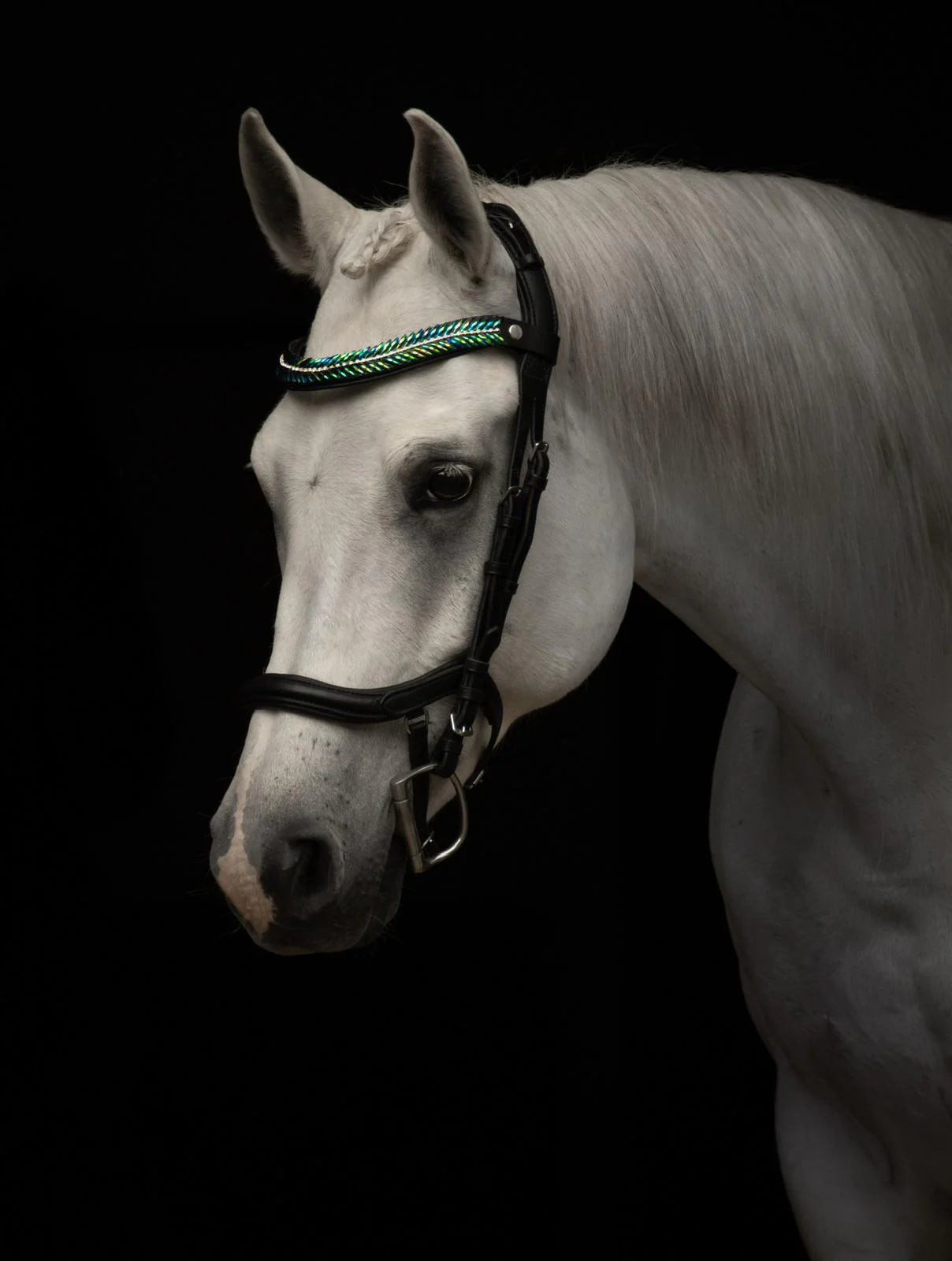 スワロフスキー額革 孔雀の羽モチーフ ターコイズ ブラック/ブラウン コブサイズのみ equosimperi